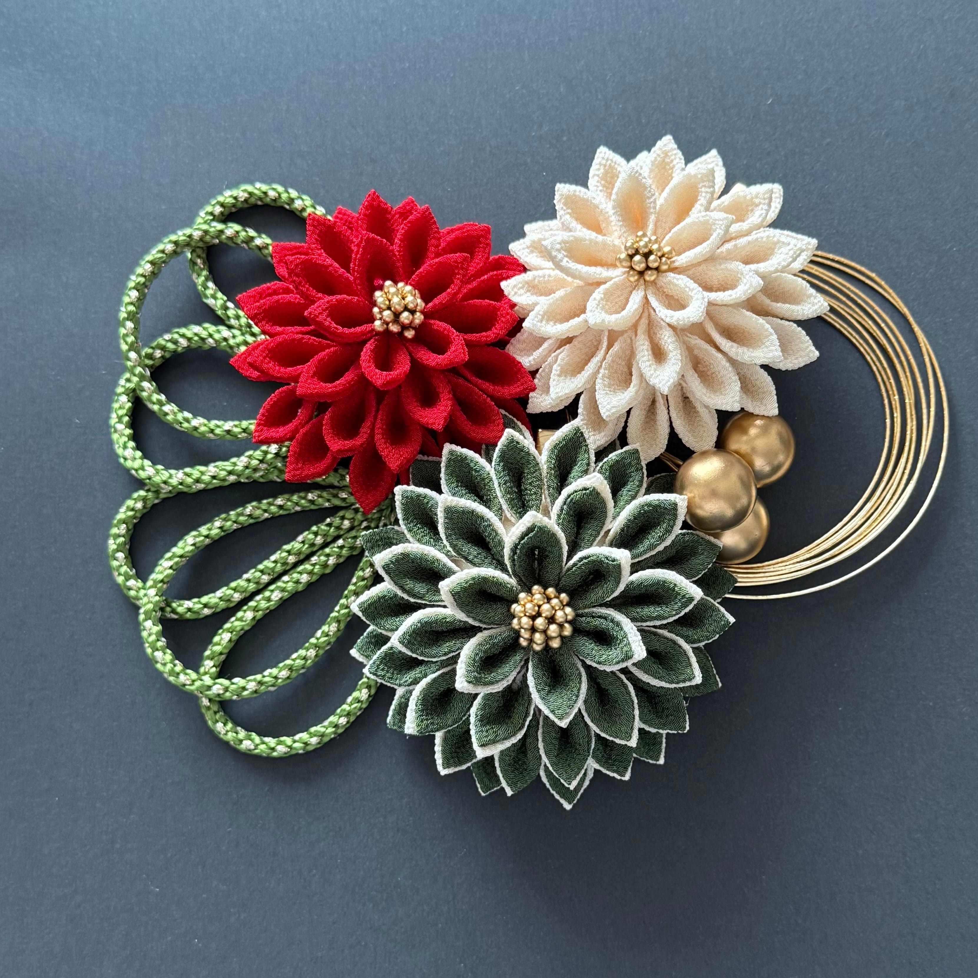 つまみ細工髪飾り 成人式 婚礼|『翠凛(すいりん)』ダリア 緑×赤×生成り 7点セット|華髪