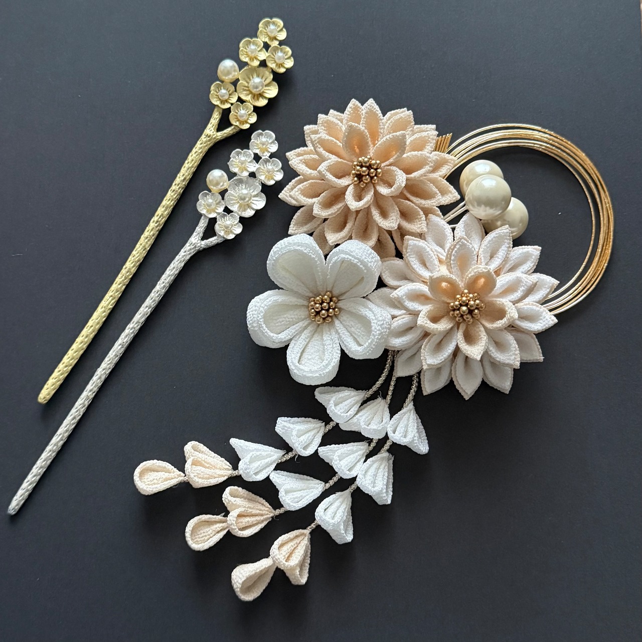 つまみ細工髪飾り 成人式 婚礼|ダリア・梅・白×生成り 8点セット|華髪