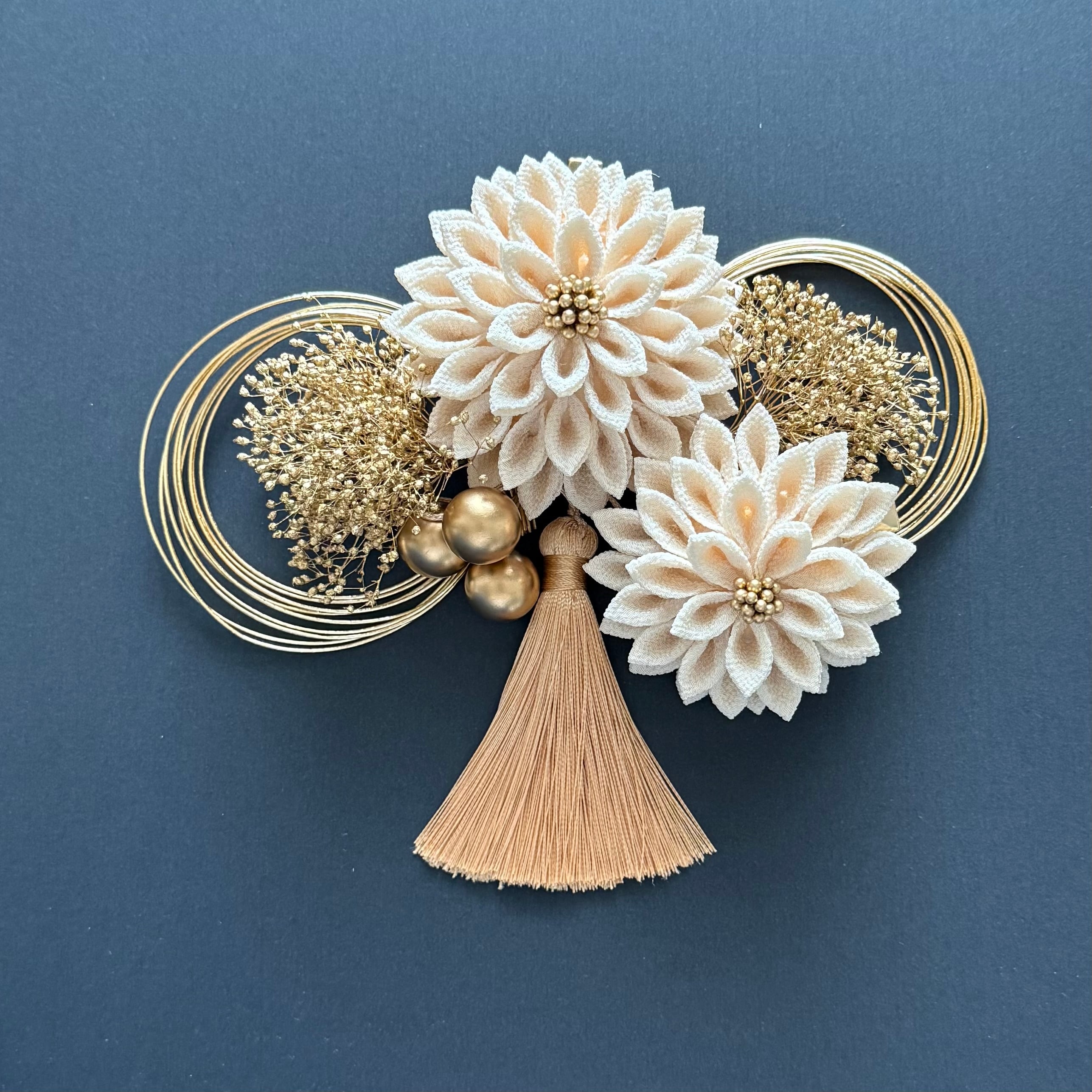 揺れるタッセルが所作とともにごく控えめなリズムを刻み、アクセントとして配したパールが金の柔光を映し返す──。装飾の一つひとつは派手に主張せず、あくまで品格を保ちながら振袖や白無垢、色打掛の柄行きを引き立てます。