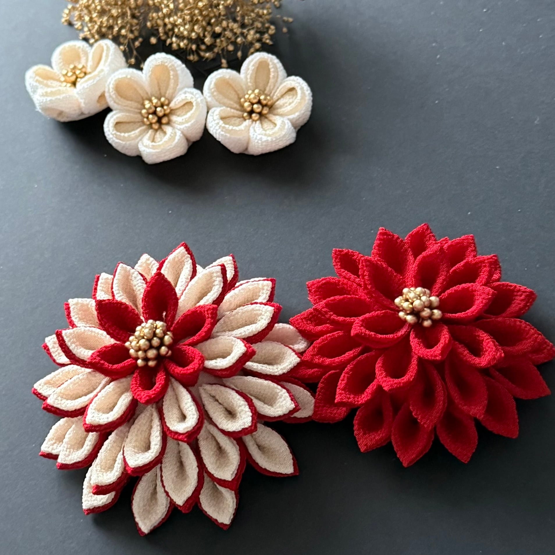 つまみ細工髪飾り 成人式 婚礼|『朱耀(しゅよう)』ダリア・梅・かすみ草 赤 12点セット|華髪